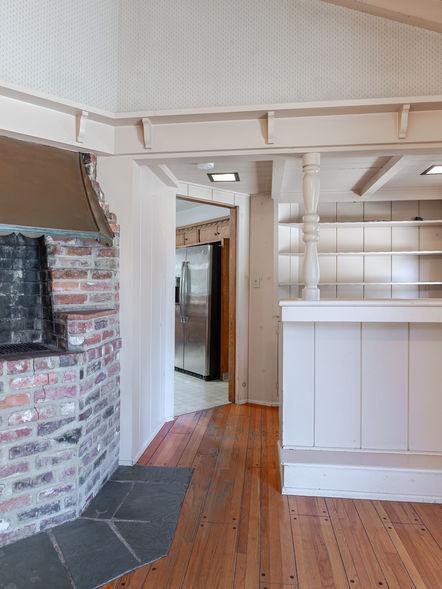 Through the wide front Dutch door, the living room welcomes with vaulted ceilings, a brick fireplace with oversized hearth, and built-in cabinetry characteristic of the style. The adjoining family room with dining area carries forward these hallmarks with peg and groove oak hardwood floors, shiplap paneling, a built-in indoor grill and restaurant quality stainless steel bar—an authentic touch of midcentury entertaining. In primarily original condition, the kitchen is anchored by a curved diner style booth and formica table and matching bean-shaped soffit with wood moldings, offering a warm setting for family meals. A vintage in-counter blender next to updated stainless steel stove, refrigerator, and dishwasher balance originality with a modern touch. Generous storage is found throughout the home, including a walk-in pantry and built-in cabinetry and closets in nearly every room. The private wing includes three bedrooms, including a primary suite with nearly floor-to-ceiling windows that open to the expansive backyard, double closets, a dressing area with built-in vanity leading to the en suite bathroom with Dutch door, freestanding shower with glass enclosure and unique corner tub. From glass doors in the family room and main corridor, the backyard beckons with mature oaks and pecans shading a sport court and generous open space, offering endless potential for gathering, gardening, and reimagining.
